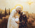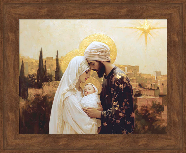 Mary and Joseph holding baby Jesus.