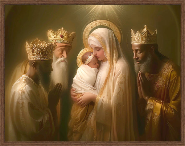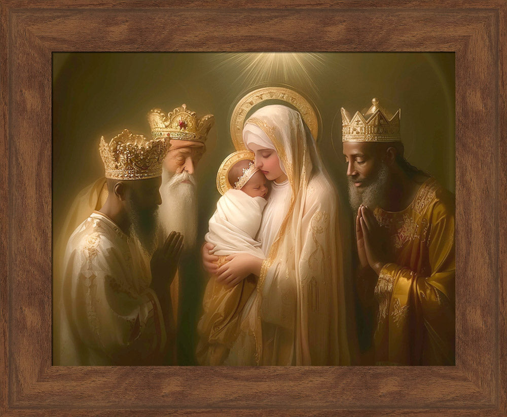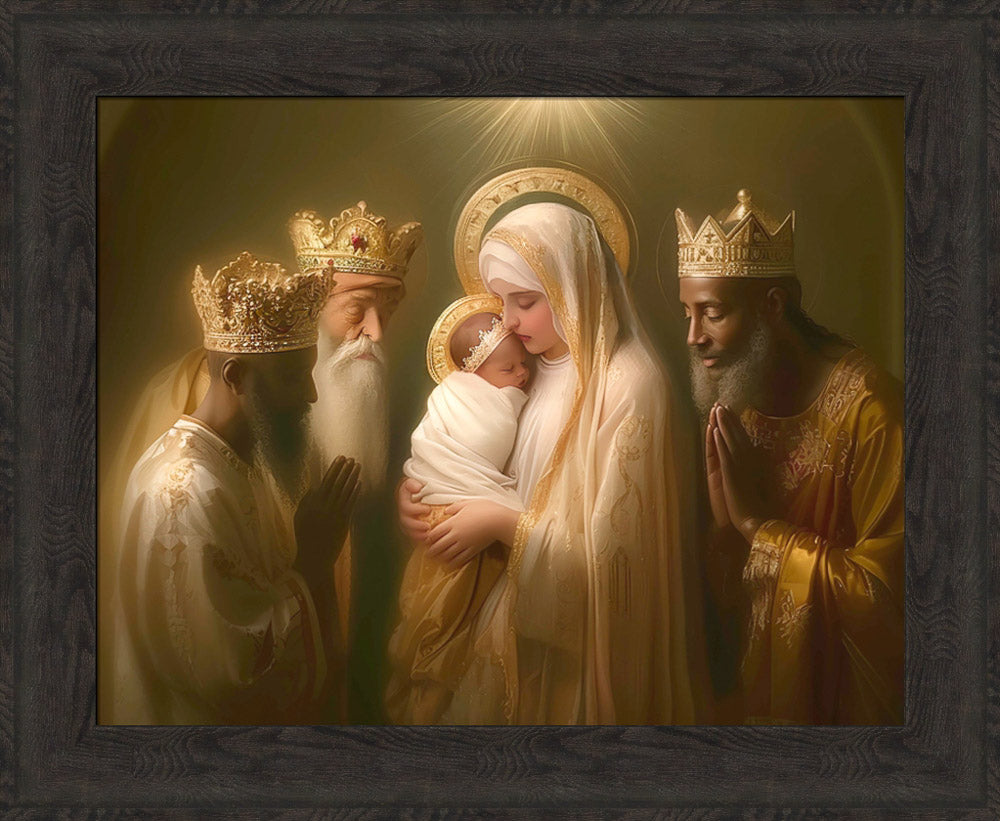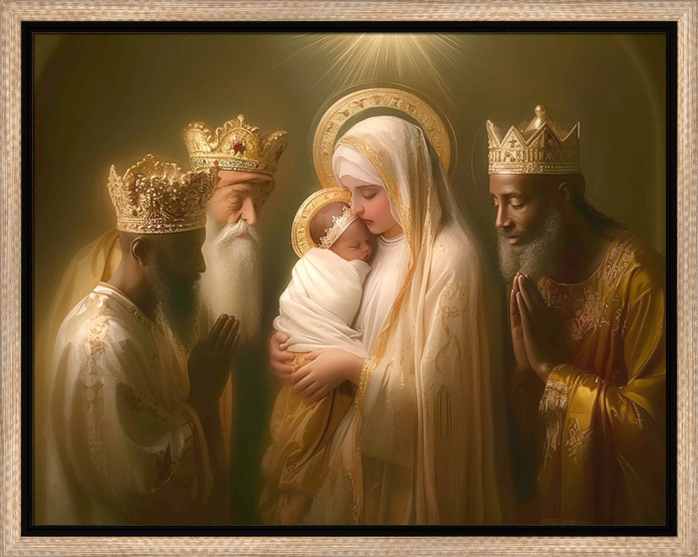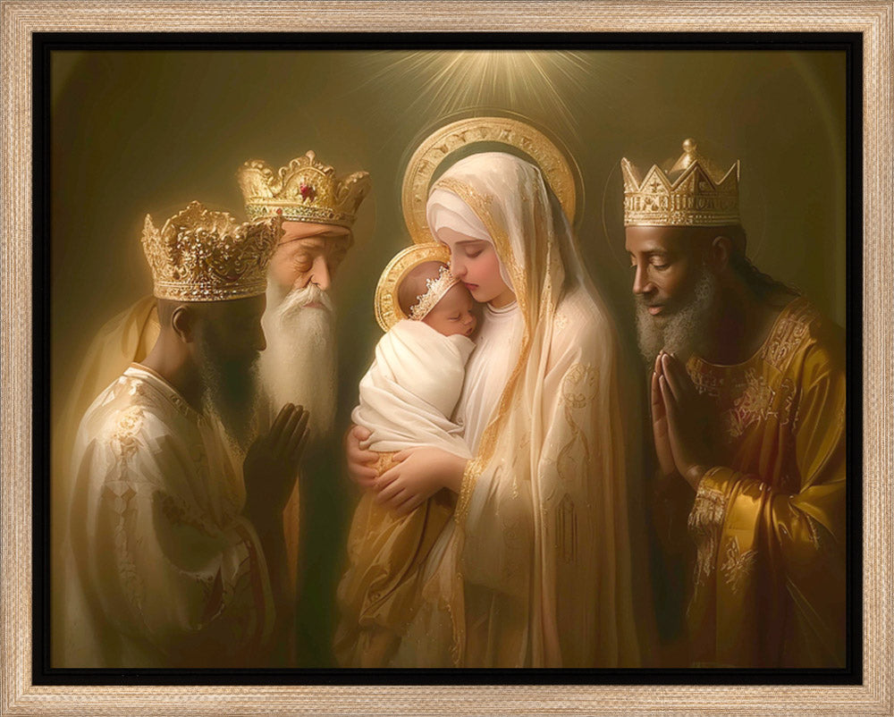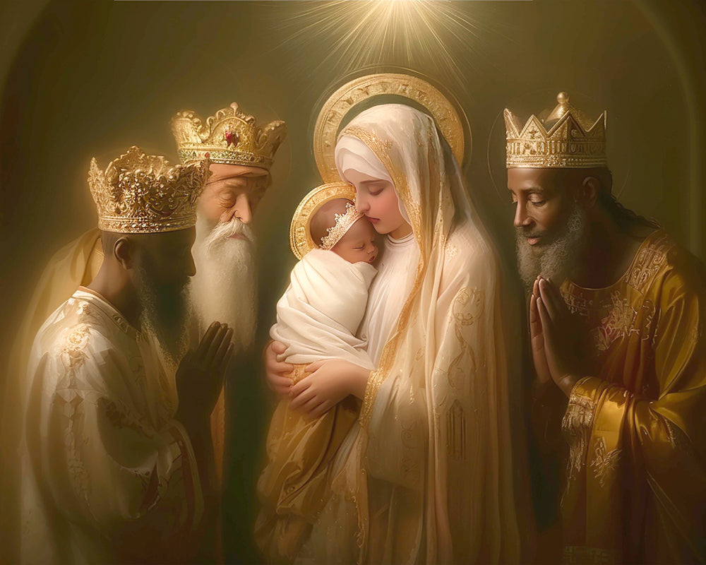 Mary with baby Jesus surrounded by three wise men.