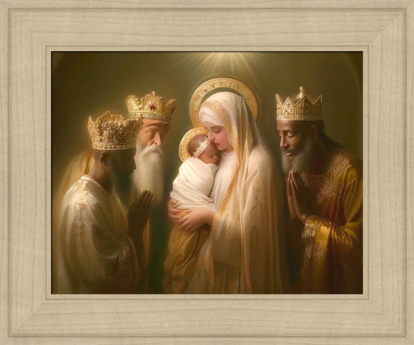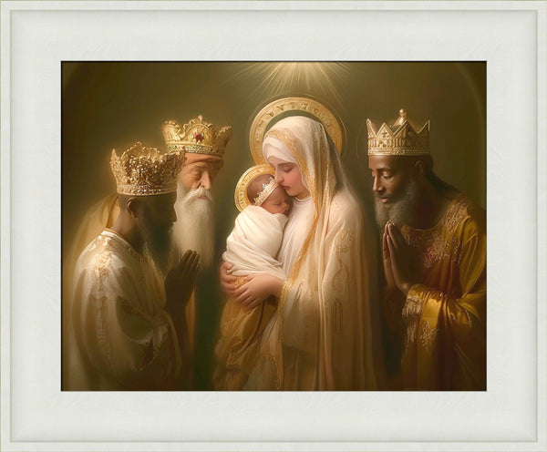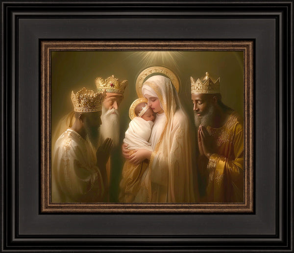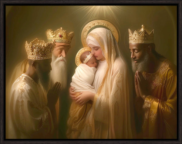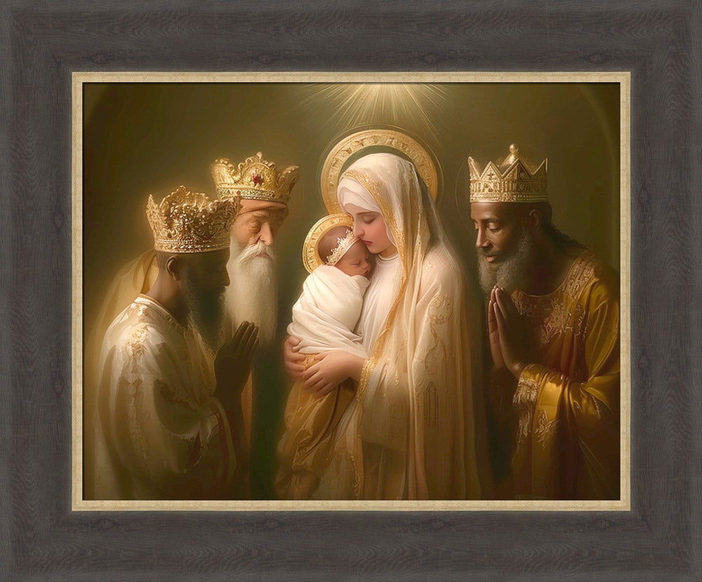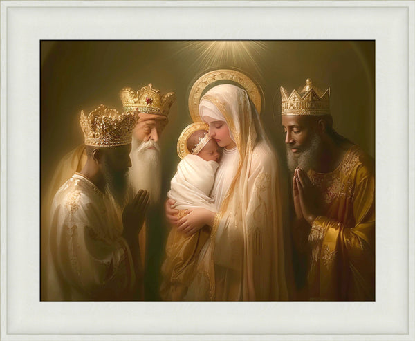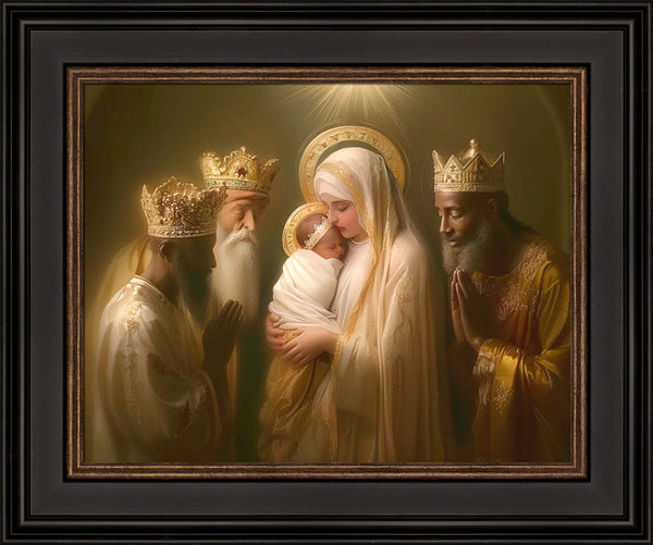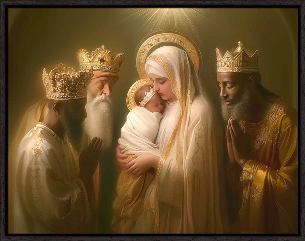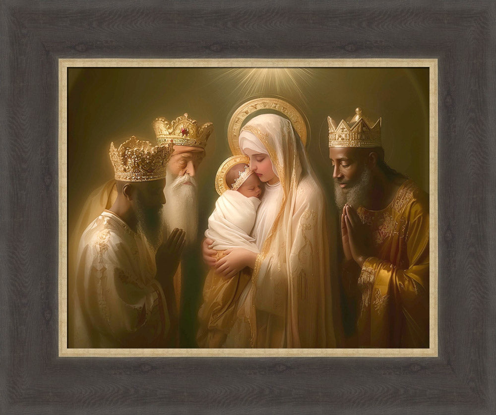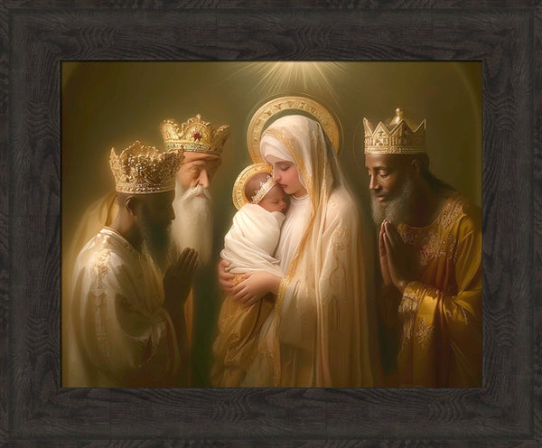 Mary with baby Jesus surrounded by three wise men.